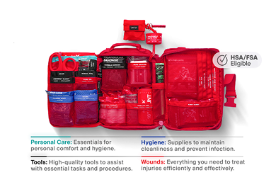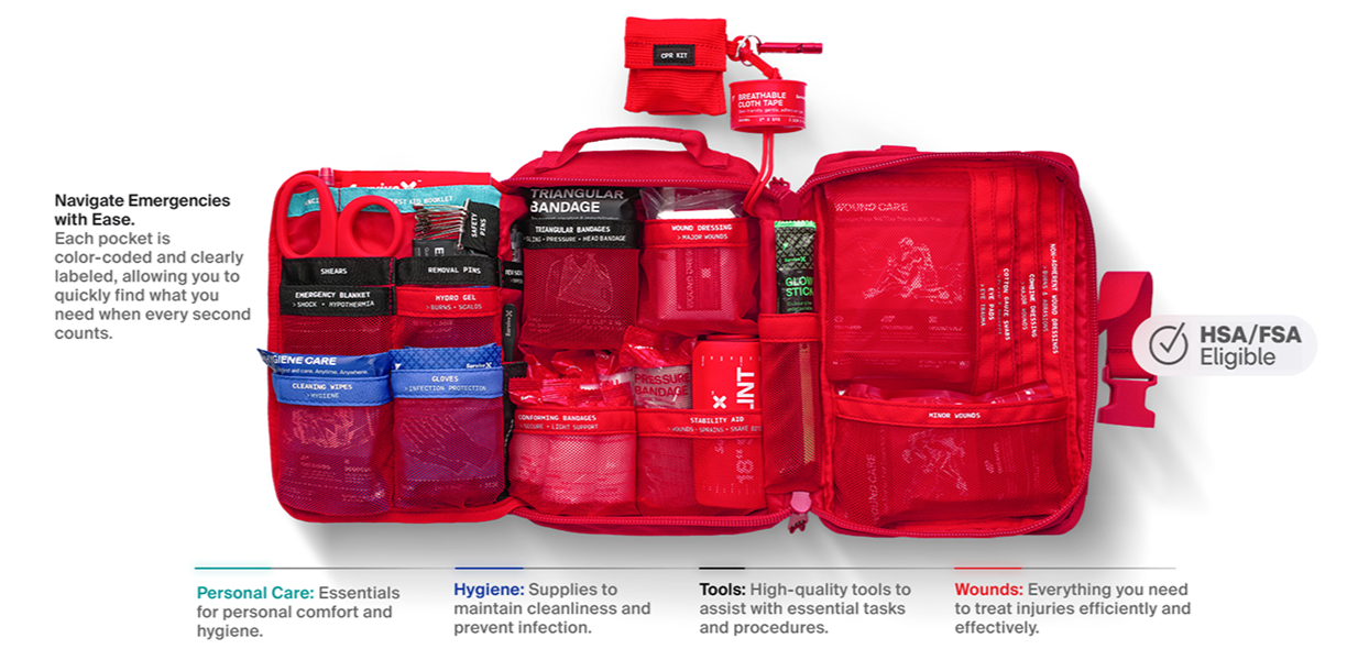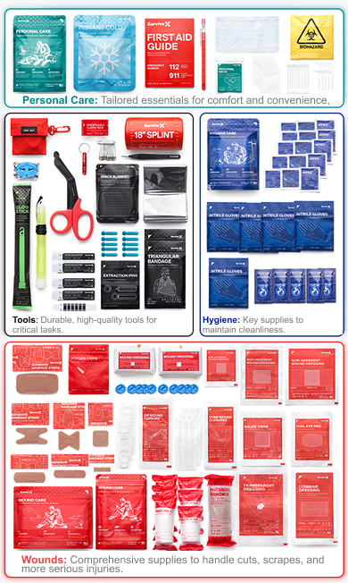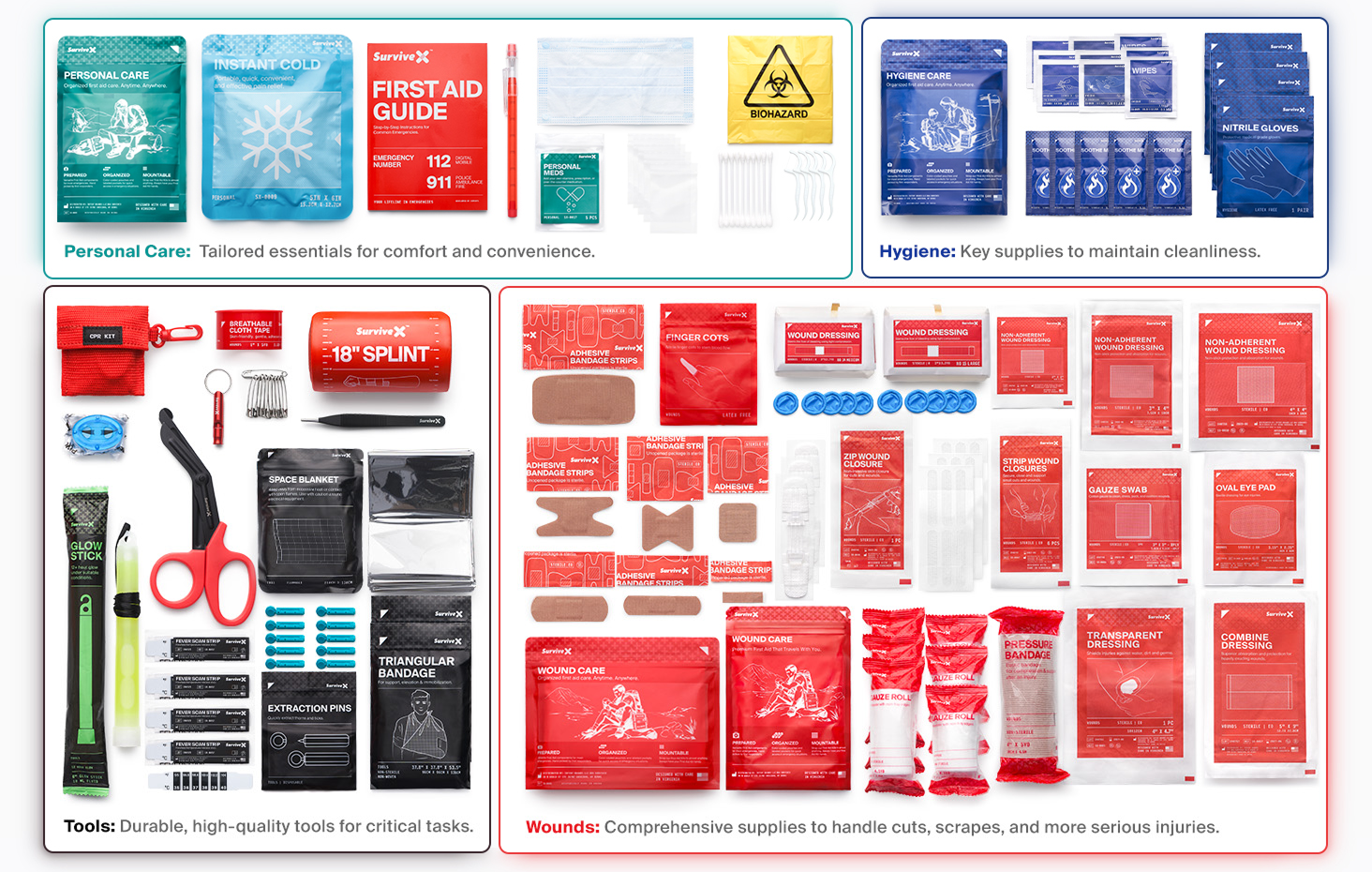 ✔️ Comprehensive Coverage - 240+ FDA-approved supplies that treat wounds, burns, sprains, hypothermia, and more